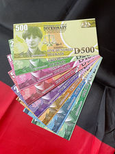 Duckionary banknotes and coins can be ordered at centralbank@duckionary.com. The banknote set consists of eigth notes and a plastic cover.
